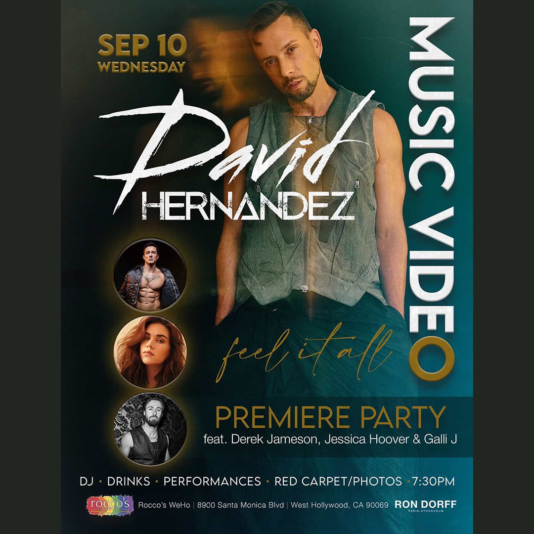 🔥MUSIC VIDEO PREMIERE PARTY!! 🔥 Come join us for the pre-screening of my new music video “feel it all” 💪🏽 Hosted at Rocco’s Weho! Feat. Live performances by yours truly, Derek Jameson, and Jessica Hoover 🚀🎶🎵 FREE ENTRY! Full cash bar w/ food, drink & non-alcoholic options as well! 🎫 7:30p DOORS 🎫 FREE ENTRY 🎬 Music Video Premiere of “feel it all” 🎤Performance by David Hernandez